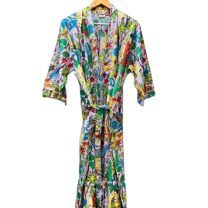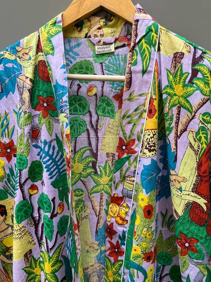 Purple Cotton Kimono Robe Indian Print Beach Cover Up For Women