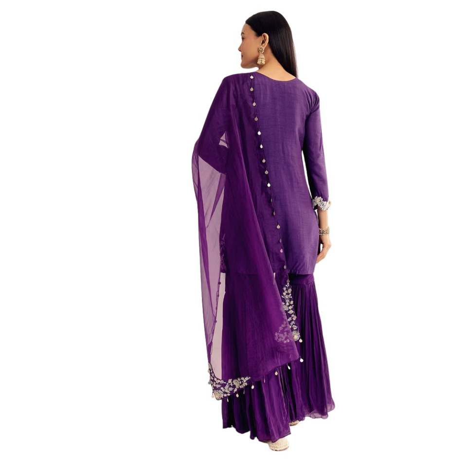 Purple Moti Threadwork Dola Silk Sharara Suit with Organza Dupatta Luxury Festive Outfit for Ladies