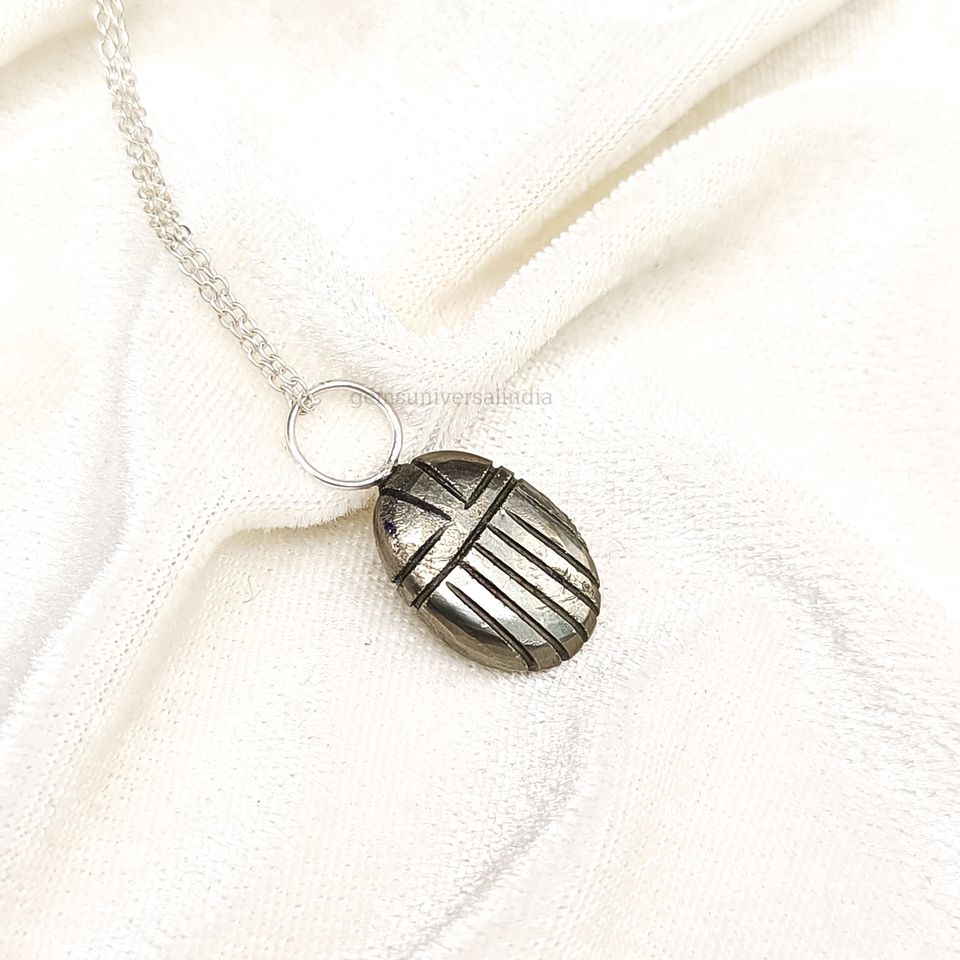 Pyrite Beetle Scarab Carved Gemstone Pendant Necklace 925 Sterling Silver, Scarab Pendant Necklace, Boho Healing Jewelry