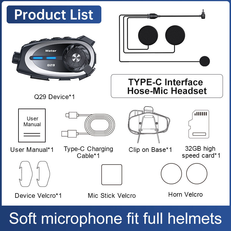 Q29 BT Motorcycle helmet intercom headset with 1080p video recorder camera and Intercom and music sharing at the same time