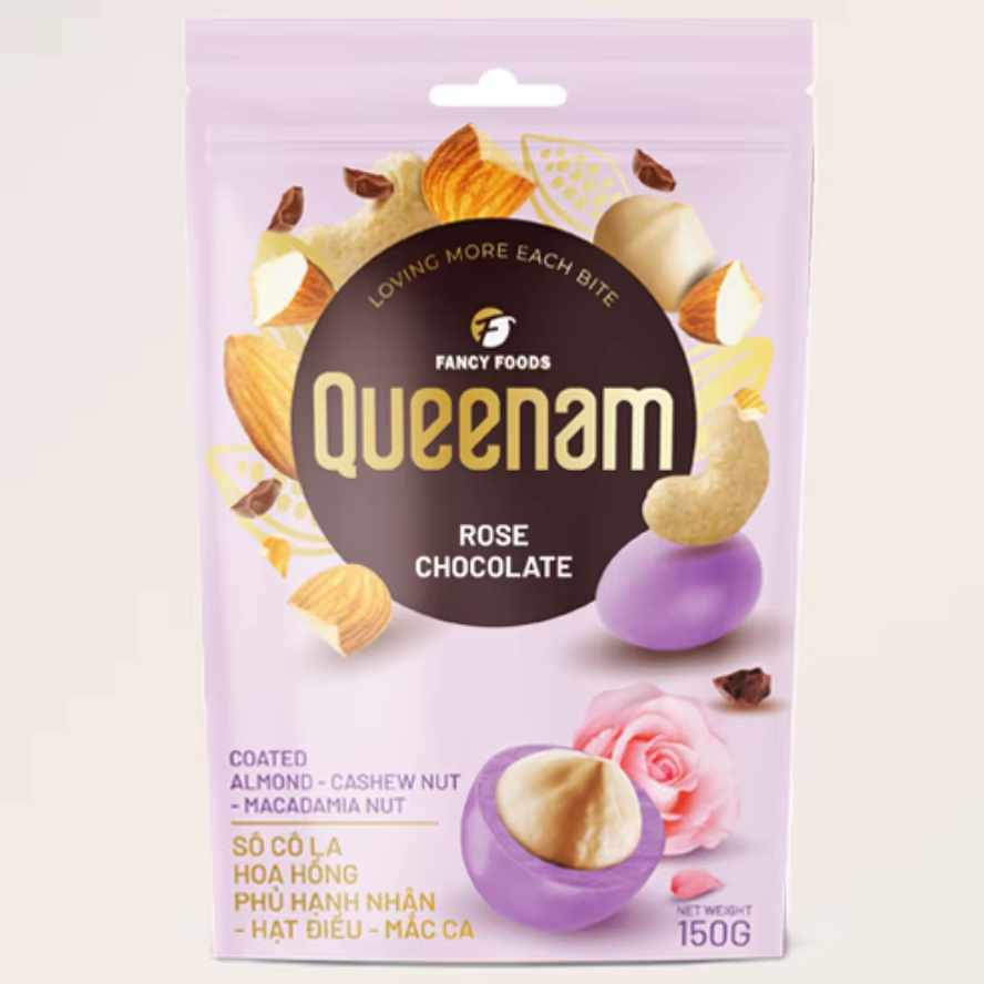 QUEENAM Vietnamese Wholesale Dragee HALAL OEM Rose Chocolate Coated Almond Cashew Macadamia Nuts 150G Food Good Price