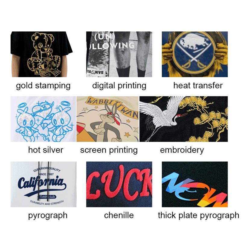 Discharge Printing, Puff Printing, Heat-Transfer Printing, Embossed, Digital Printing, Silk Screen Printing, Ready-Made Apparel Direct Injection Heat-Transfer Printing, Ready-Made Apparel Direct Digital Printing, DRIPPING, Raised Rubber Print, Sublimation Transfer Print, Glitter Print, Foil Print, Luminous Print, Flock Print, Other, Pigment Printing, silicone printing, Crack printing, WATERMARK, tatami stitches, ink print, Laser Printing, HD print, reflective printing, Plastisol Print, Flexography, Hand Drawn, None