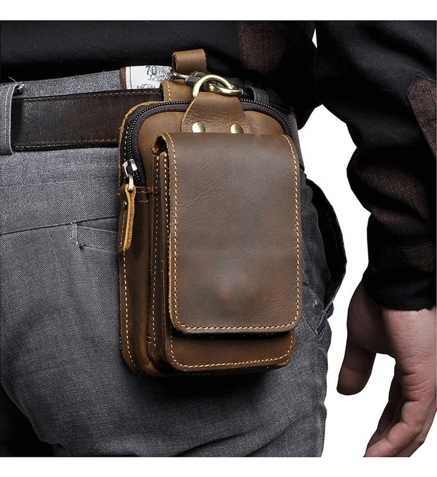Quality Leather Men Retro Coffee Travel Belt Fanny Waist Bag 6.5" Phone Cigarette Case Shockproof Custom Branding LKU-0571