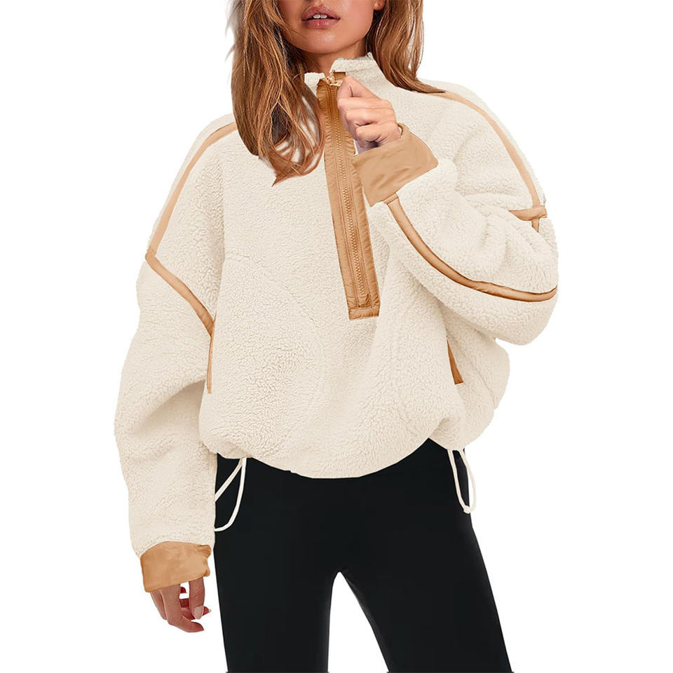 Quarter Zipper Casual Women Sherpa Hoodie Solid Color Hooded Long Sleeve Stand Up Collar Side Pocket Keep Warm Plush Hoodies