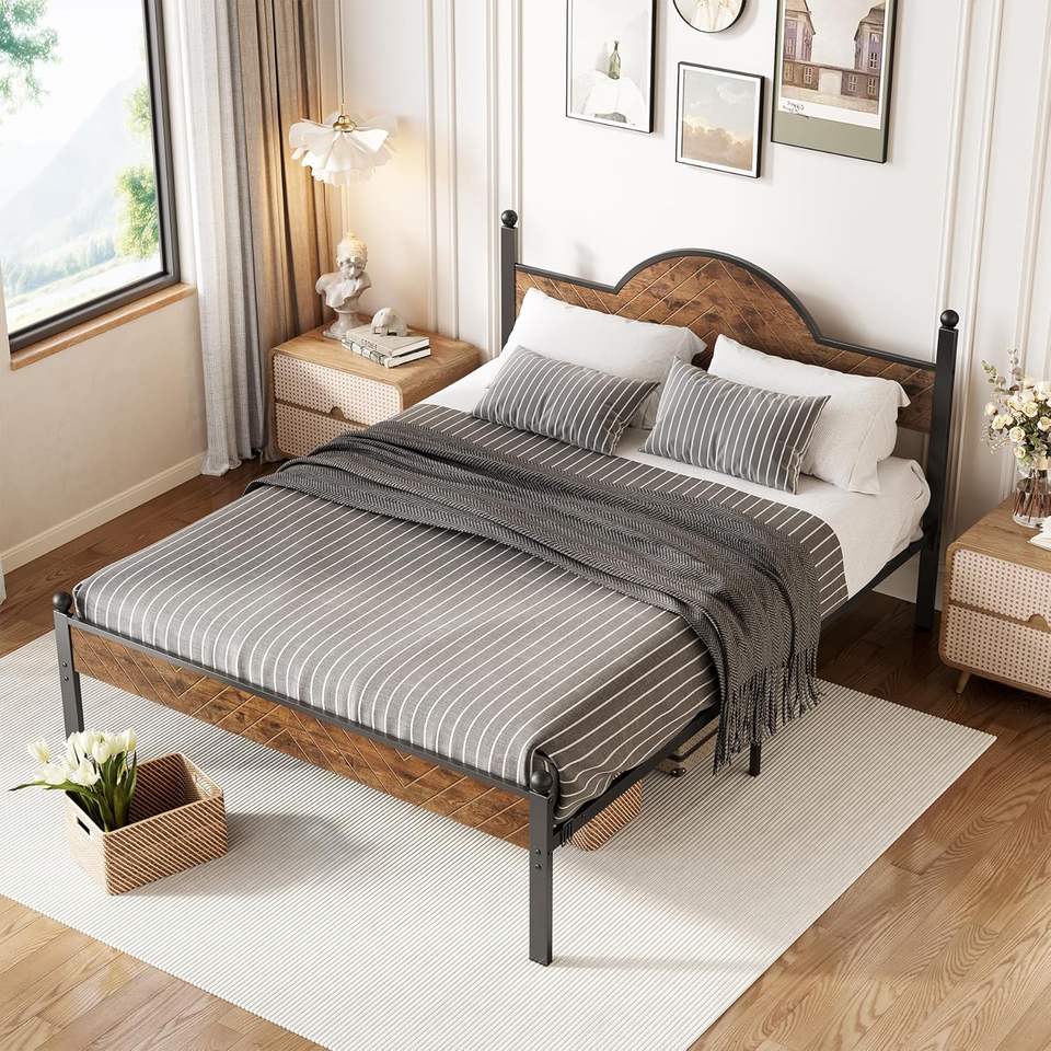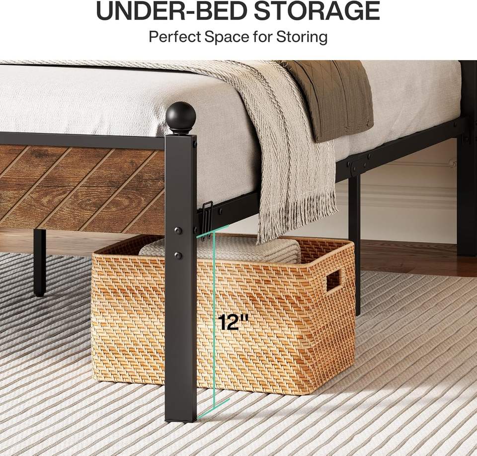 Queen Bed Frame Height-Adjustable Headboard Footboard 12\" Bed Storage Rustic Brown Wooden Beds No Box Spring Easy Traditional