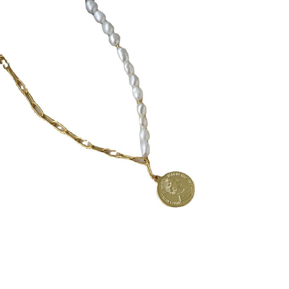 Queen Gold Coin Circular Needle Pin Adjustable Niche Unique 14K Gold Wrapped Freshwater Pearl Necklace Trendy Collarbone Chain