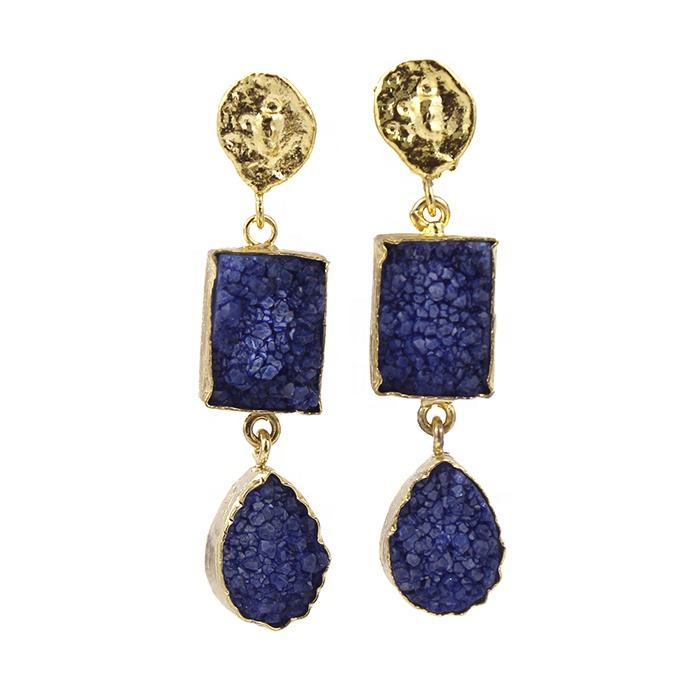 Queen Handmade Fashion Drop Earrings Pink Double Druzy Gemstone with Pear Yellow Gold Plated Push Back Handmade Jewelry