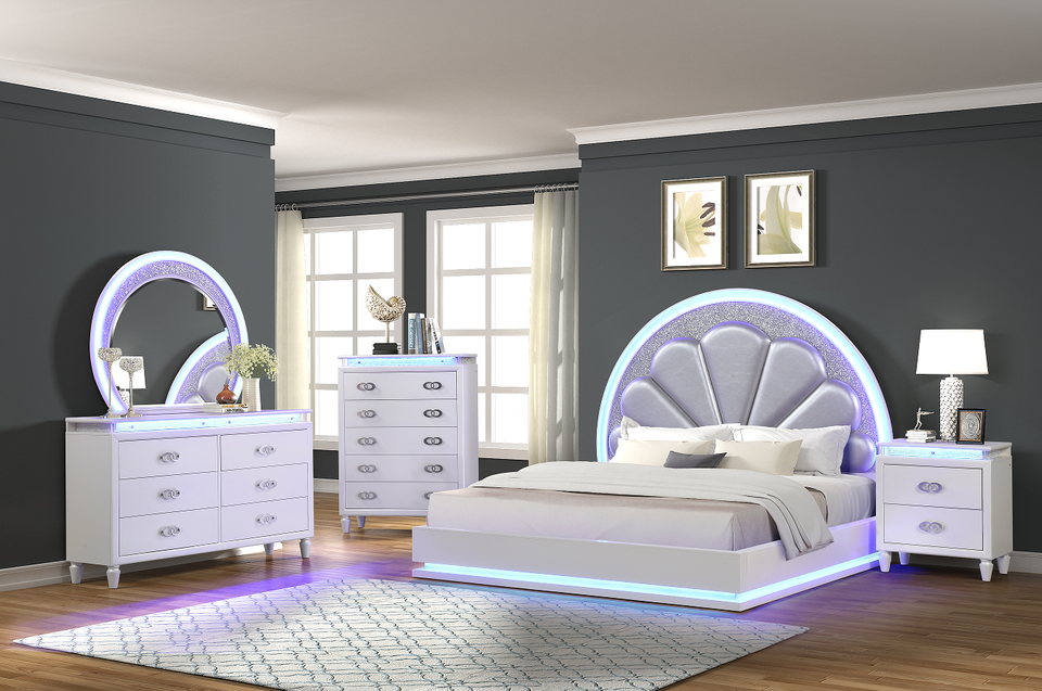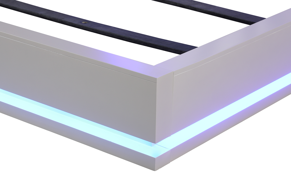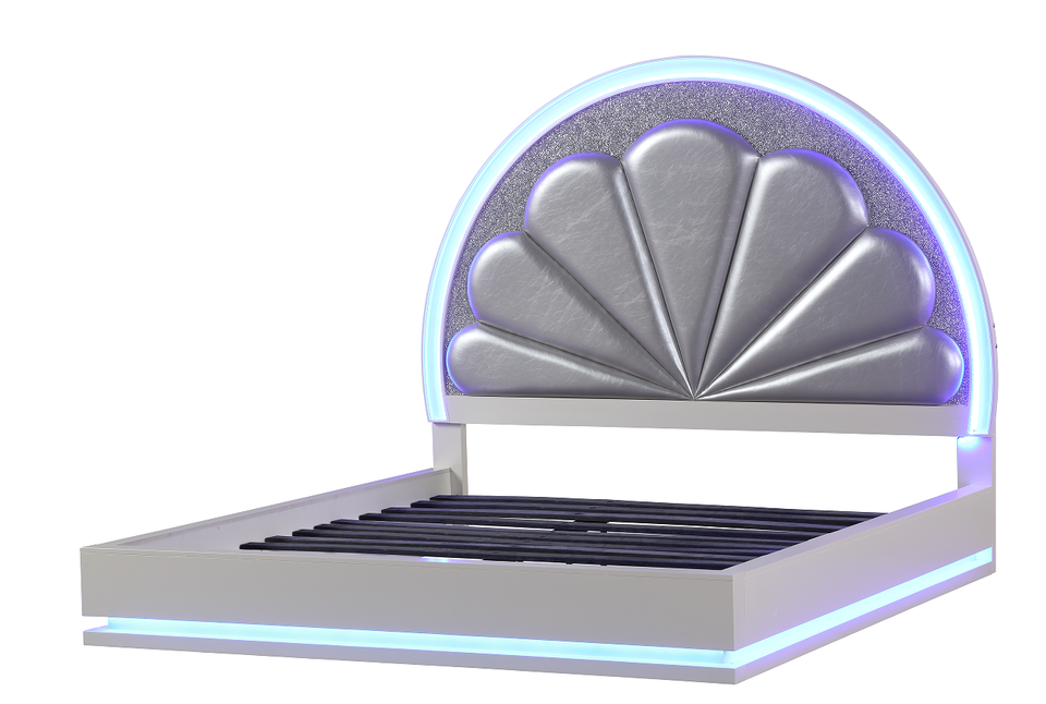 Queen Size Modern Adjustable LED Storage Bed with Wood Upholstery in Milky White