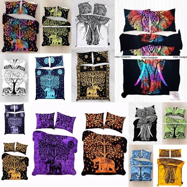 Queen Size Reversible Duvet Cover Set Beautiful Cotton Animal Print Bedding with Elephant and Tree Comforter Quilt Cover