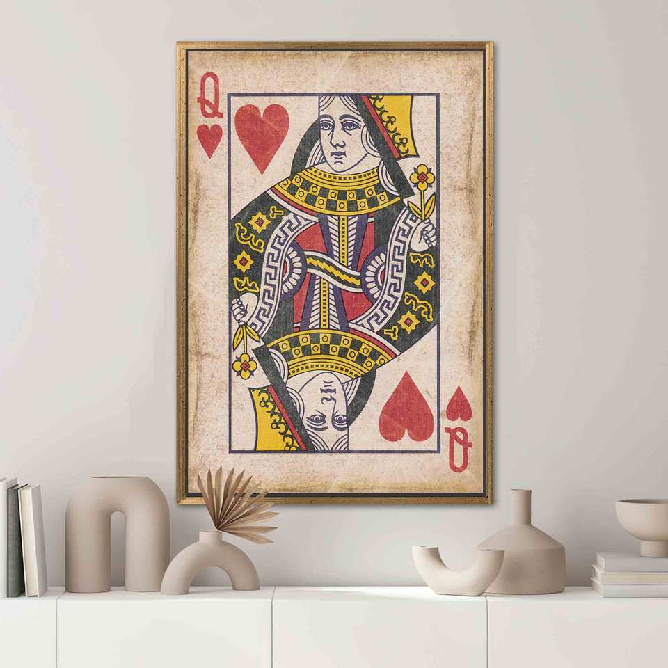 Queen of Hearts Playing Card Printed Canvas - Modern Abstract Wall Decor,Gold Framed