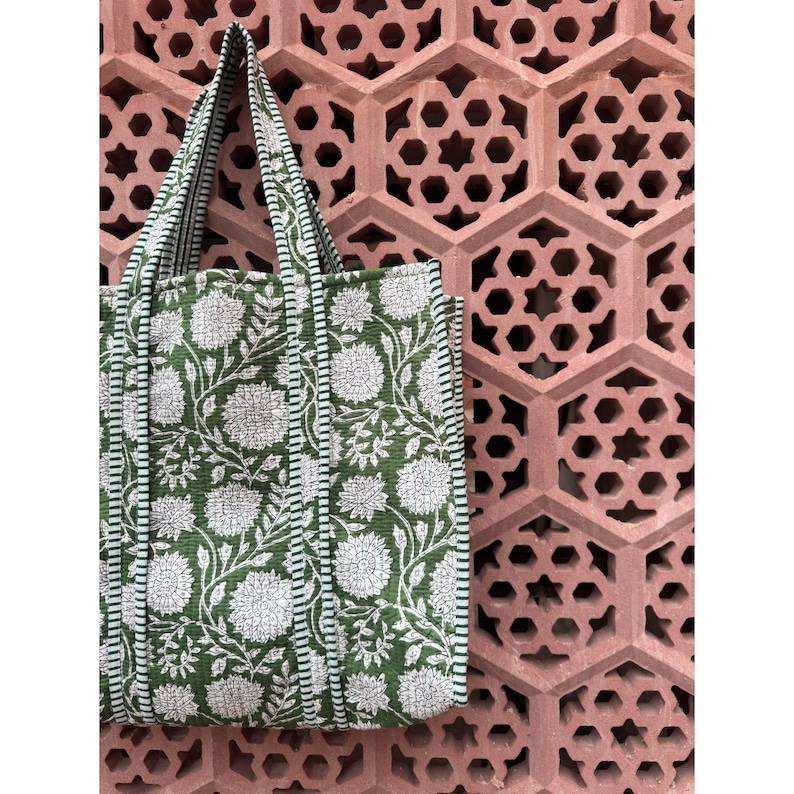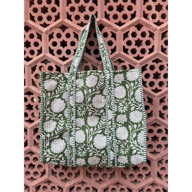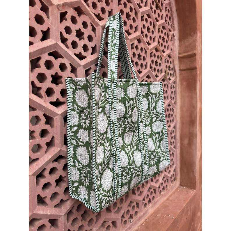 Quilted Cotton Boho Gingham Green Stripe Handprinted Reversible Large Tote Bag Eco-Friendly Sustainable Sturdy Grocery Fashion