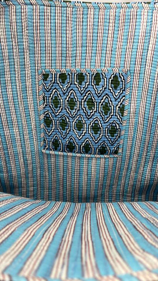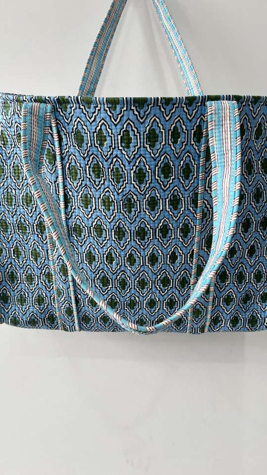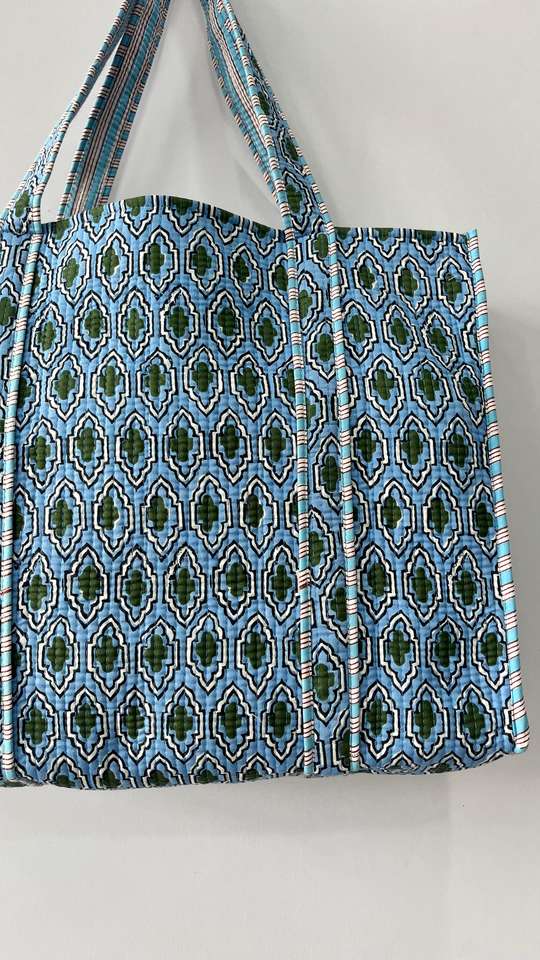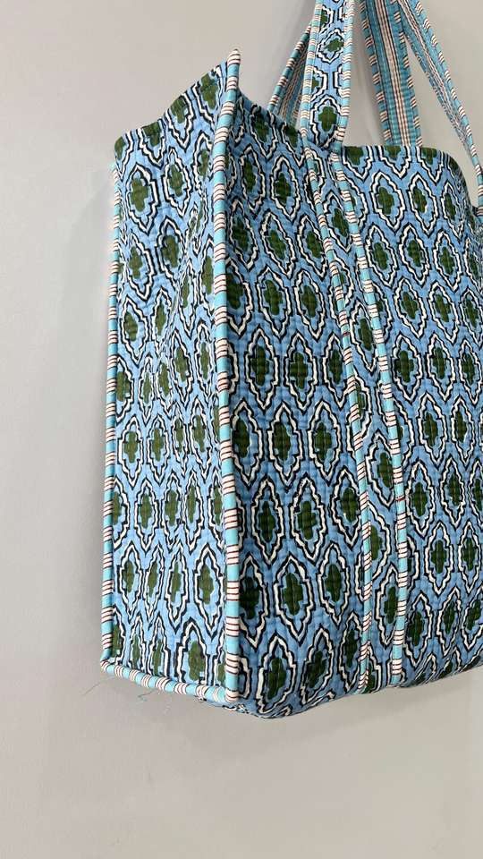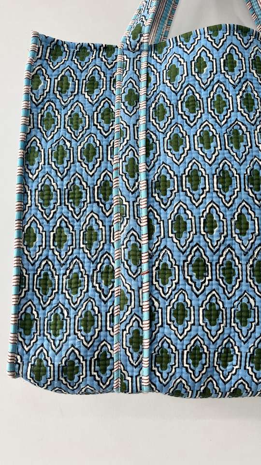 Quilted Cotton Boho Tote Bag Handprinted Reversible Large Blue Floral Eco-Friendly Open Closure Shopping Bag Handmade