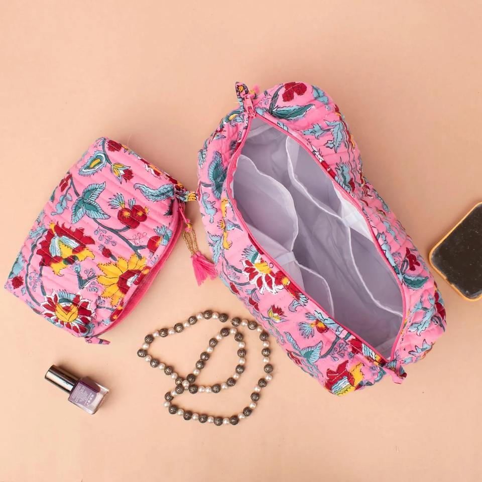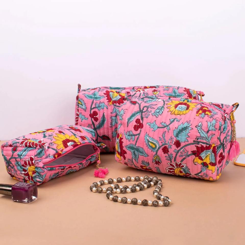 Quilted Cotton Eco-Friendly Vintage Case Makeup Pouch Travel for Bag Set 3 Women's Washbag Organizer Medium/Large Cosmetic