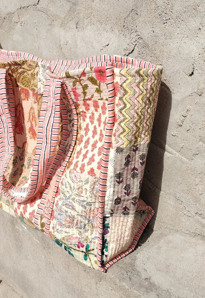 Quilted Cotton Handprinted Reversible Large Tote Bag Eco Friendly for Shopping Bag Grocery Shopping Handmade Artist Boho