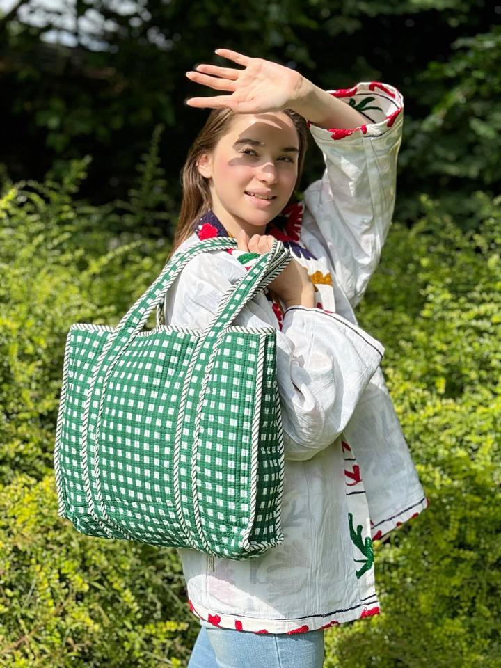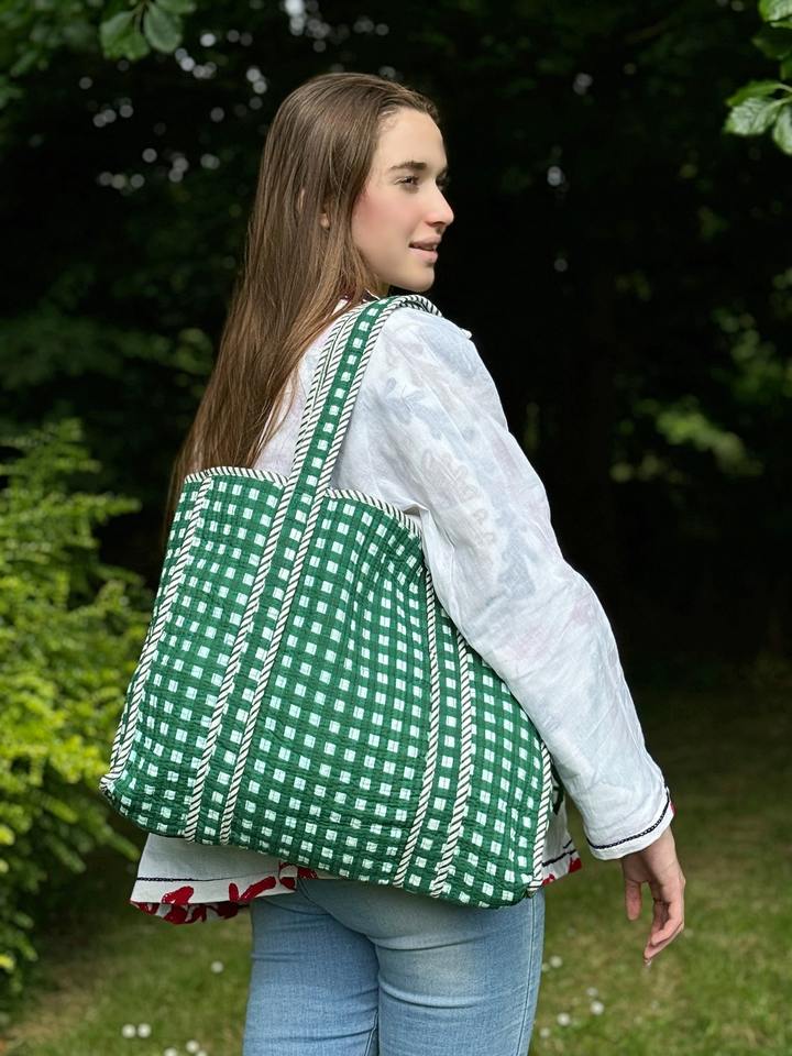 Quilted Cotton Handprinted Reversible Large Tote Bag Eco friendly Sustainable Sturdy Grocery Shopping Boho Summer Gingham Green