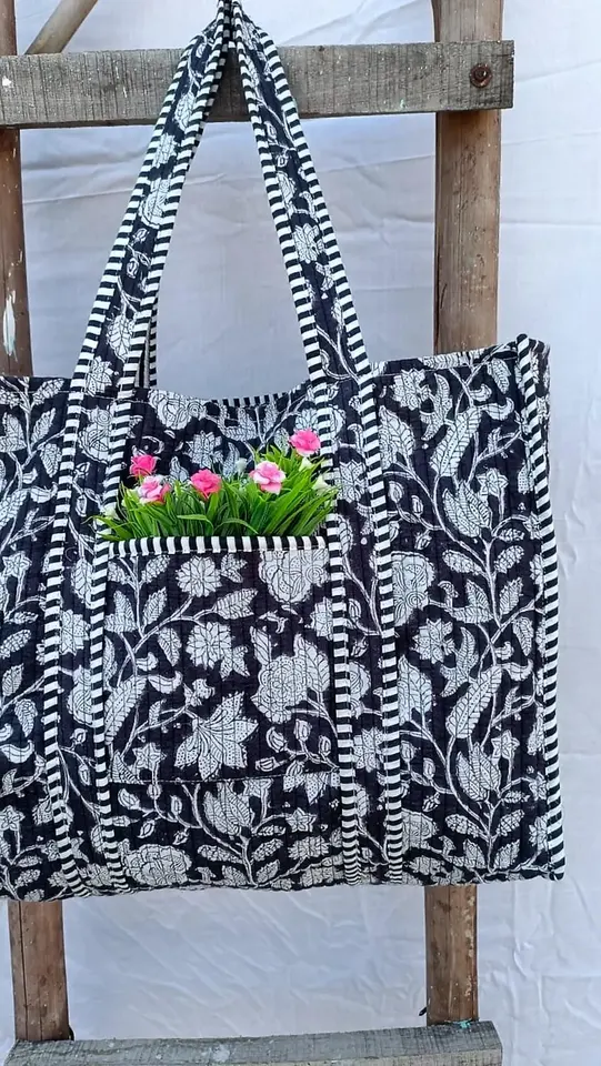 Quilted Cotton Reversible Large Tote Bag Hand Printed Daily Shoulder Shopping Bag Eco-Friendly Quilted Duffel for Summer