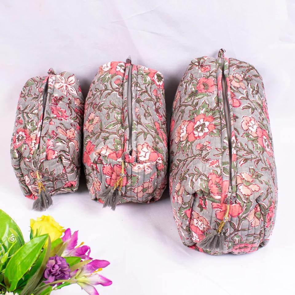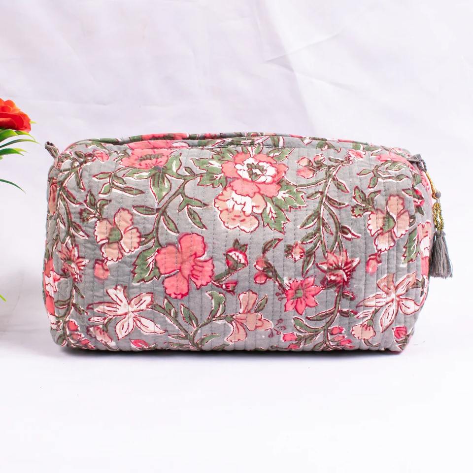 Quilted Cotton Wash Bag Handmade Vintage Grey Floral Print Eco-Friendly Durable Water Resistant Zipper Closure Makeup Storage