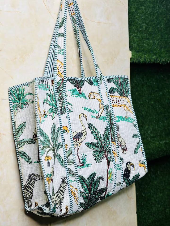Quilted Cotton Tote Bag for Women Eco-Friendly Open Closure Shoulder Bag with Two Handles Printed Ethnic Flowers Design