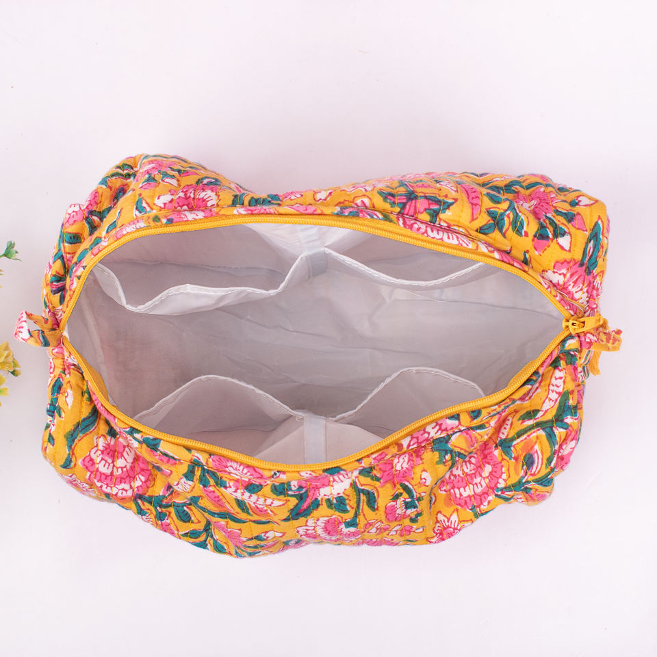 Quilted Eco-Friendly Large Summer Block Print Makeup Cosmetic Pouch Bag Cotton Fashionable Toiletary Case Women