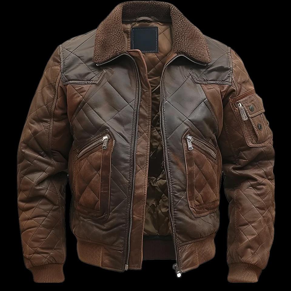 Quilted Genuine Leather Bomber Jacket for Men Vintage Winter Wear with Canvas Fabric Waterproof & Windproof