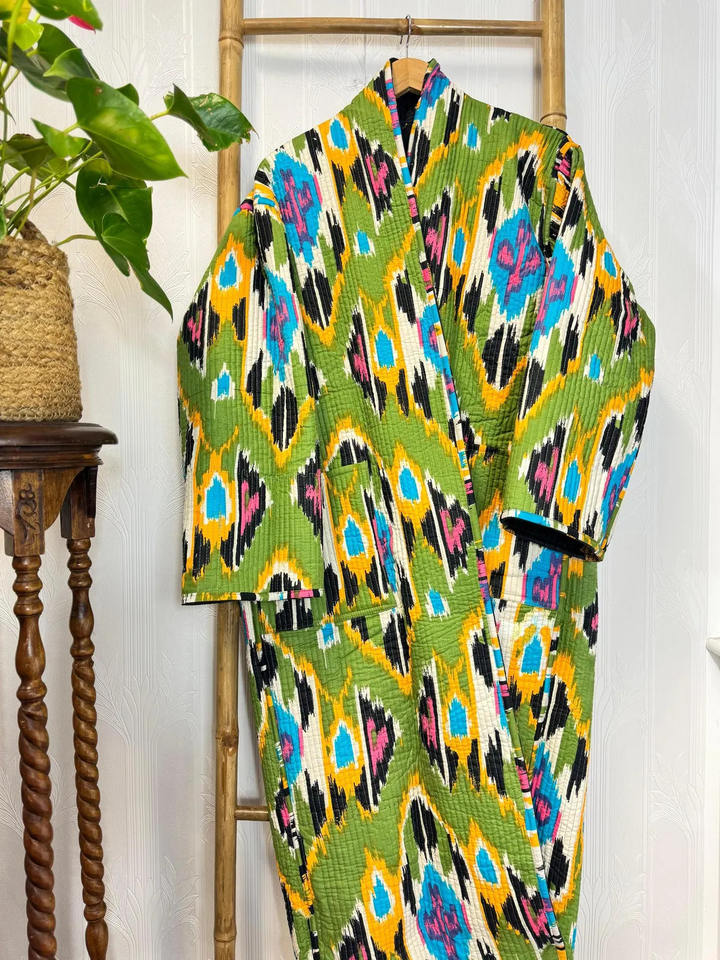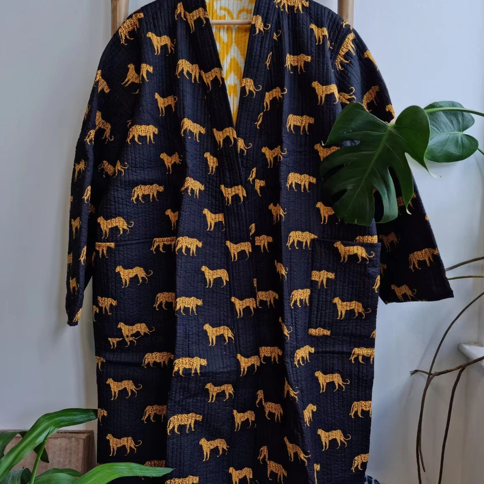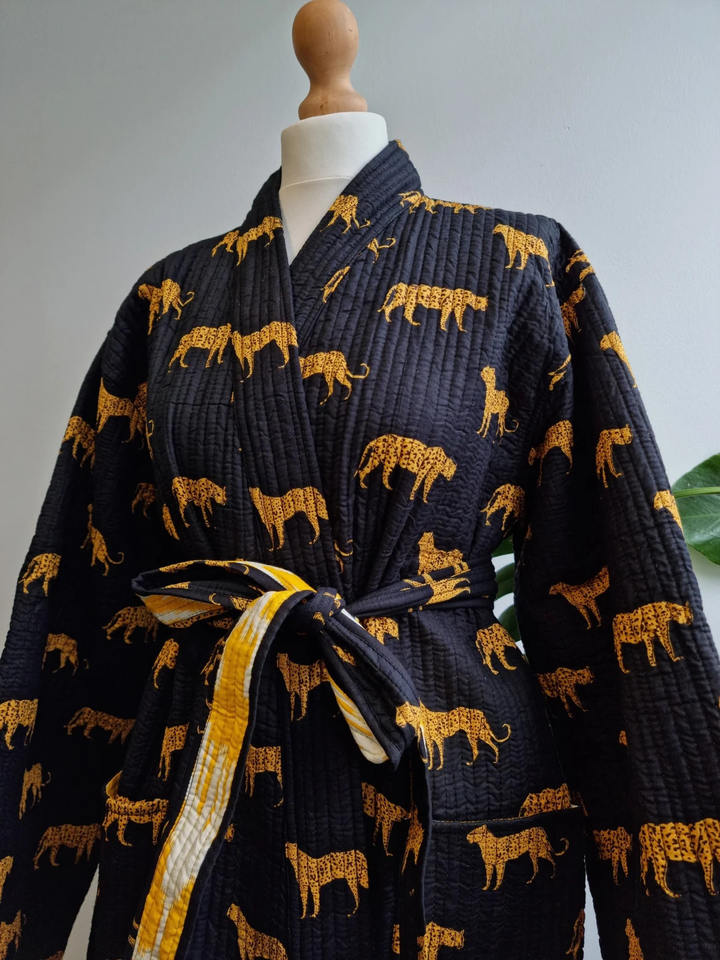Quilted Unisex Pure Cotton Reversible Long Autumn Winter Dressing Kimono Robe V-neck Long Sleeve Animal Print For Women