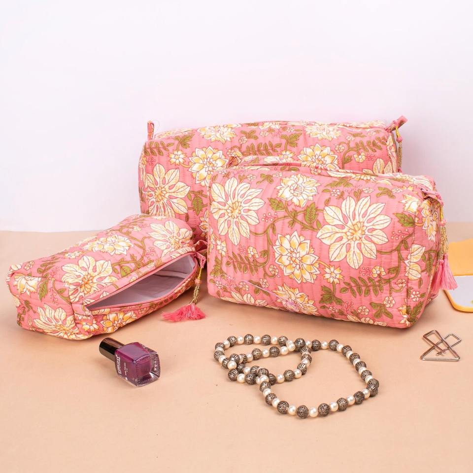Quilted Vintage Small Cotton Cosmetic Case Set 3 Travel Makeup Organizer Tassels Mother's Day Gift Eco-Friendly Water Resistant
