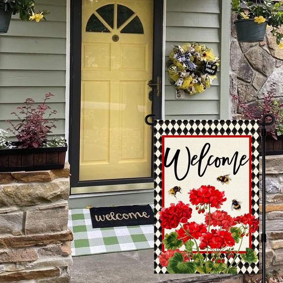 RABUSOFA 12x18 Inch Double Sided Spring Summer Garden Flag Geranium Welcome Floral Polyester Machine Washable Bee Multi Flag