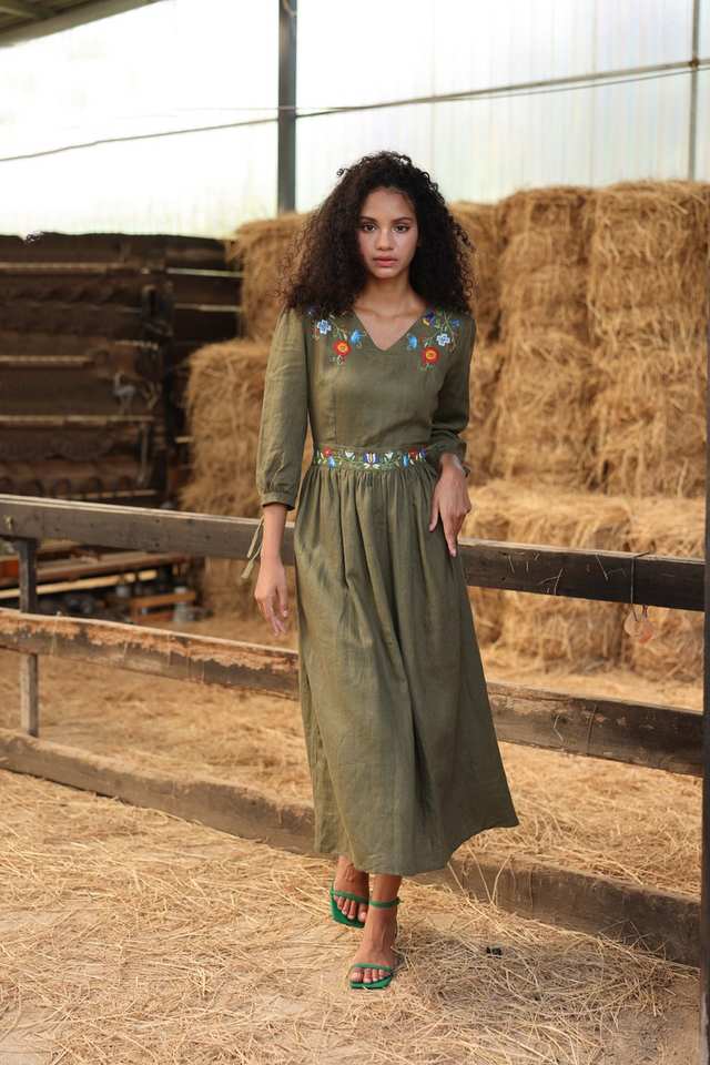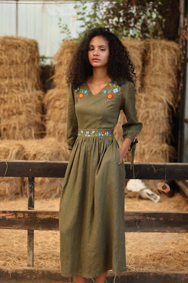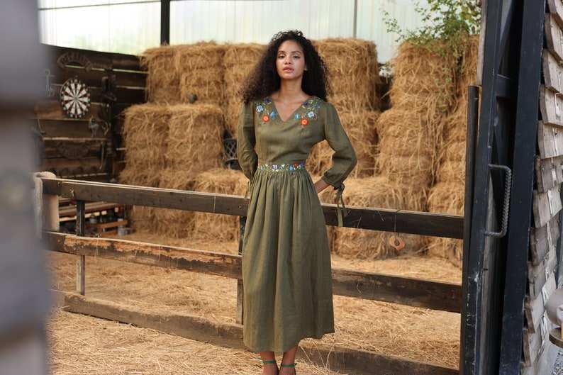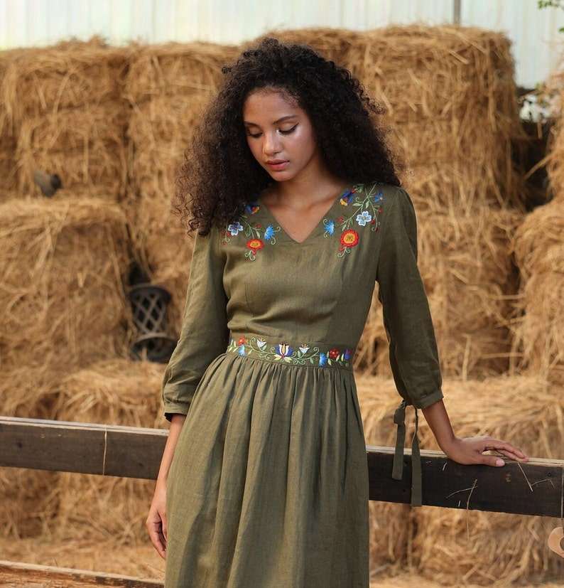 RACHEL Floral Embroidered Linen Dress With V Neck Elegant Polish Kaszubian Style For Wedding Guests
