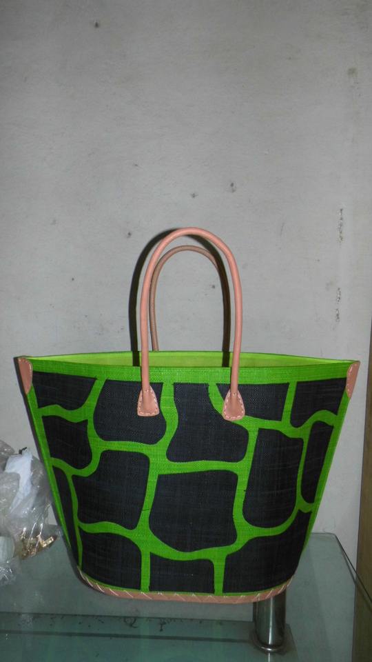 RAFFIA Beach Bag with Leather Handles Corners Drawstring Fabric Closure Inside Straw Lining Zipper Scarf Flower Decorations