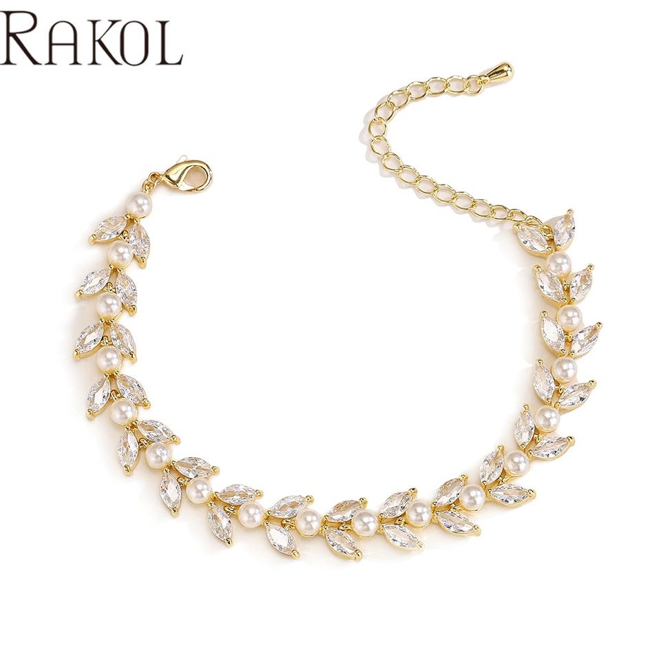 RAKOL BP1031 Women's Fashion Leaf Design Pearl Cubic Zirconia Boutique Jewelry Bracelet