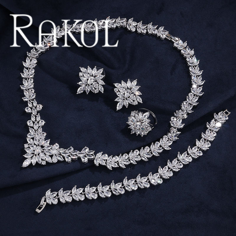 RAKOL SP313 Wedding Bride Zircon Necklace Earrings Bracelet Ring Crystal Cubic Zirconia Leaf 4-Piece Jewelry Set