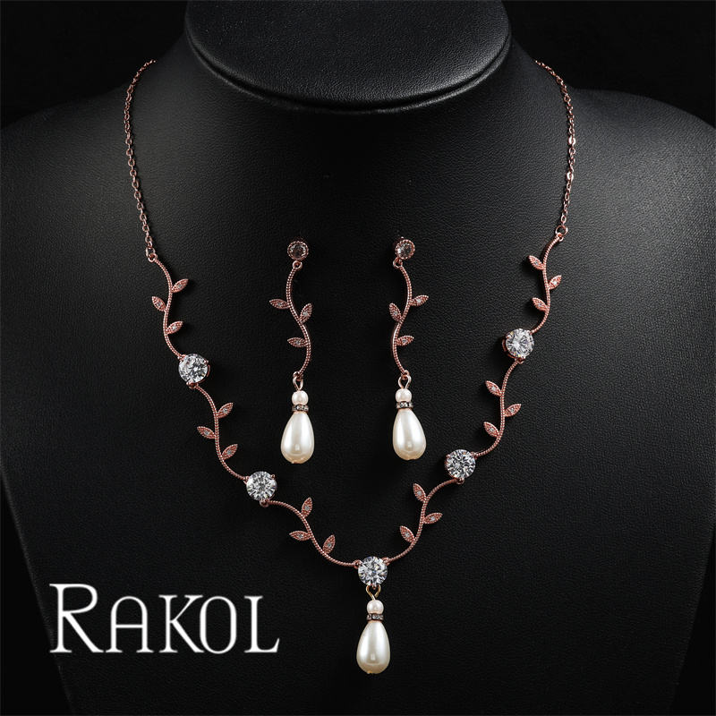 RAKOL SP3587 Pearl Pendant Necklace Earrings 2023 AAA Zirconia Leaf Design Real Gold Plated Jewelry Set
