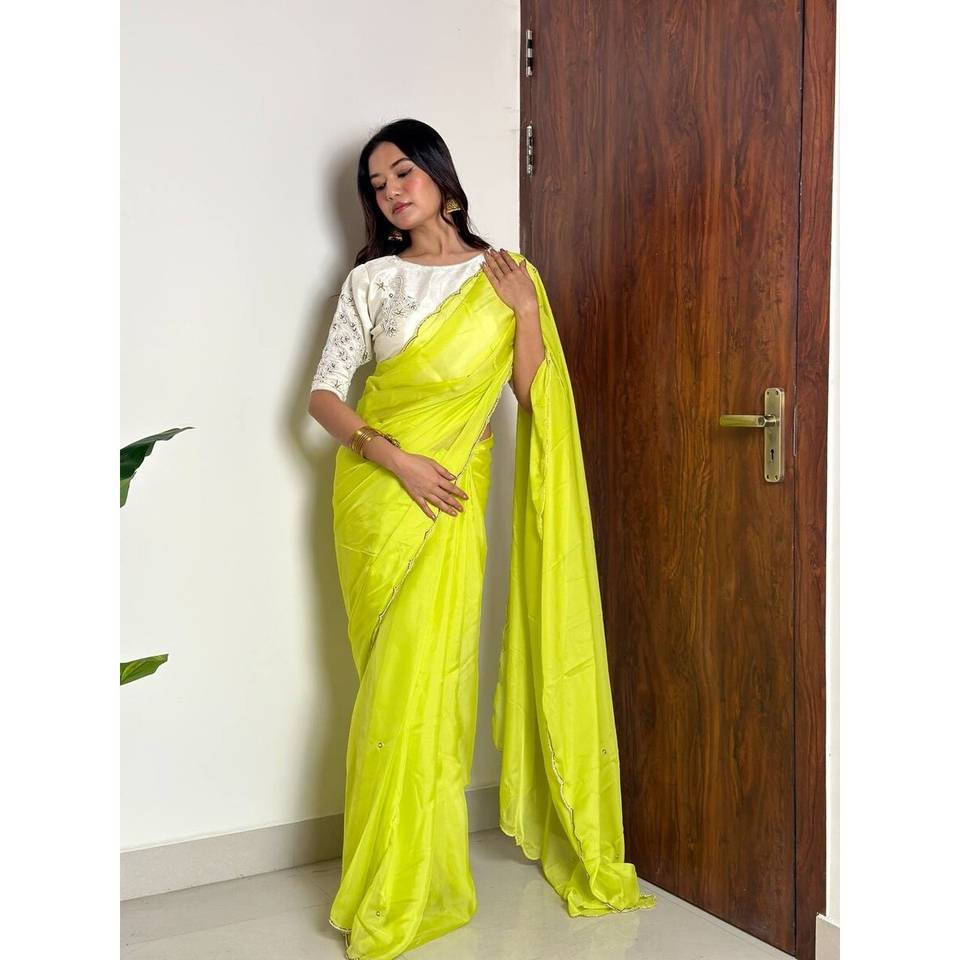 RICH LOOK ORGANZA SILK HAND PEARL CUT WORK SAREE WITH UNSTITCHED BLOUSE PARROT GREEN