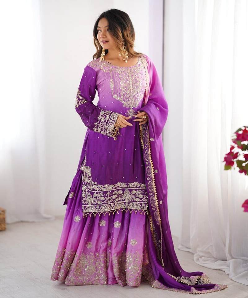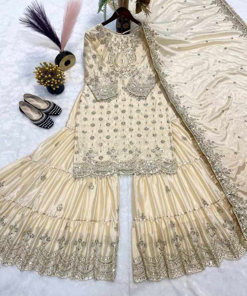 RICH WHITE CHINON EMBROIDERY SEQUENCE WORK TOP SHARARA WITH DUPATTA WEDDING WEAR WHOLESALE PRICE ETHNIC GARMENT