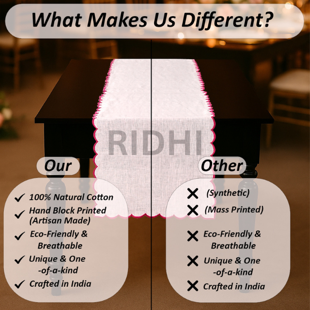RIDHI High Quality Embroidered Solid Light Pink Scallop Edge Hand Block Print Customizable Cotton Table Runner for Home Party