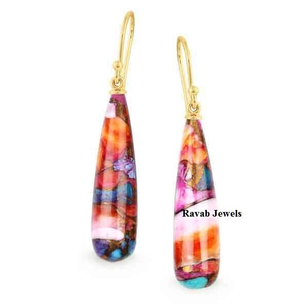 RJE00048 925 Sterling Silver Gemstone Dangle Earring Style Drop Shape 9x30mm Spiny Oyster Copper Pink Blue Gold Plated Jewelry