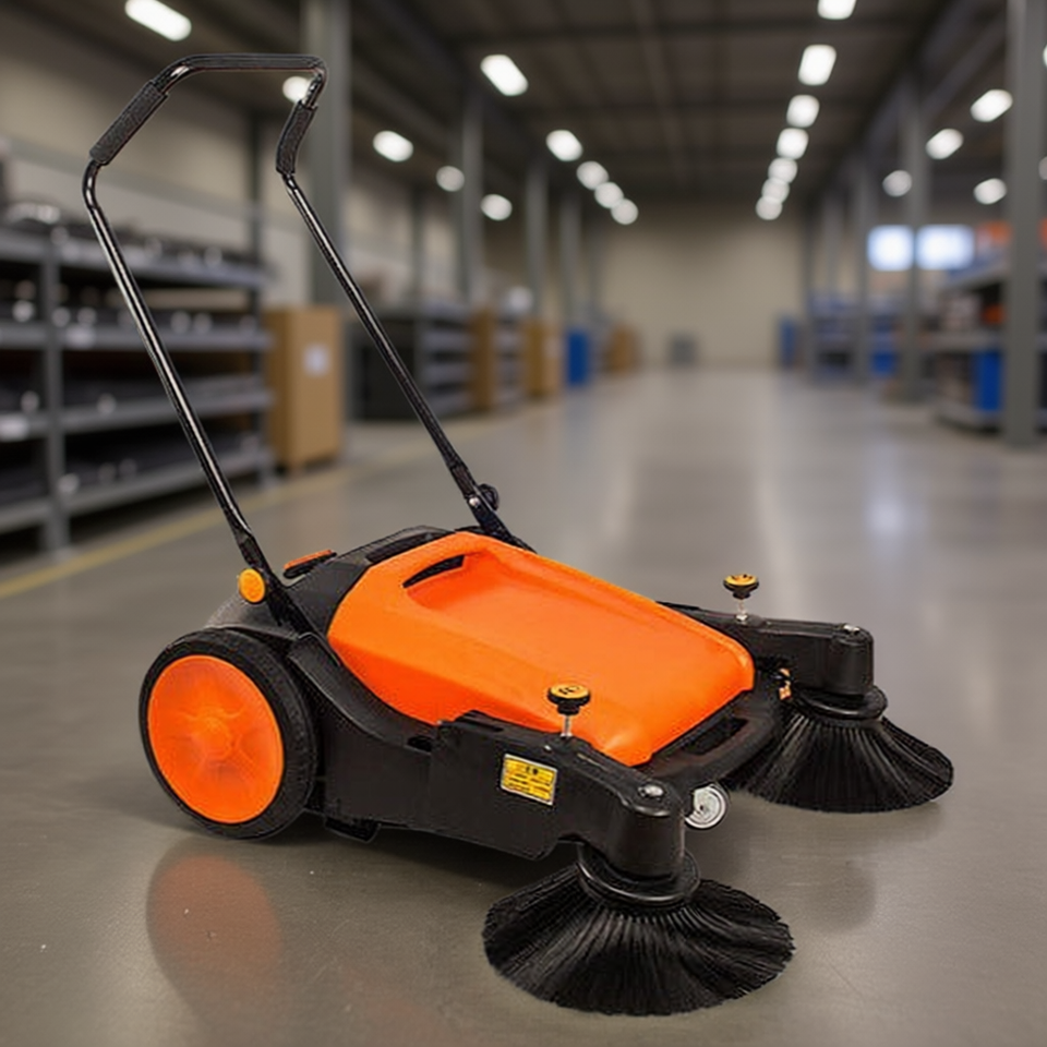 Rt980 Manual Push Floor Sweeper 38.6 In Cleaning Width 12 Gallon Container Triple Brushes Commercial Use