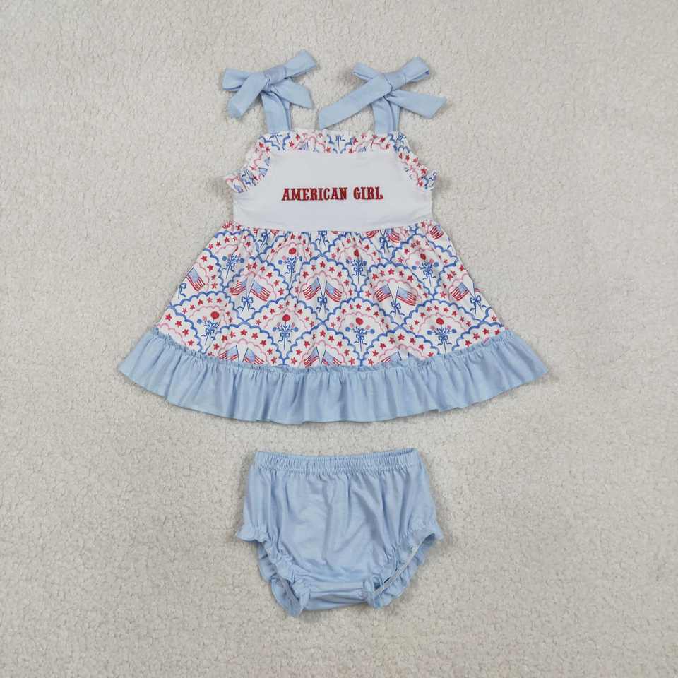 RTS American Girl Flag Bows Embroidery Casual Breathable Kids Tunic Shirt Bummie 2-Piece Outfit Cute Toddler Newborn Baby Girl