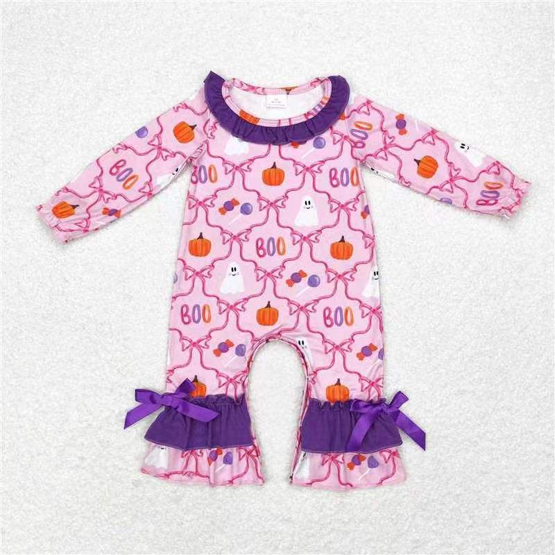 RTS Infant Girl purple plaid pumpkin embroidery Jumpsuit Long Sleeve Wholesale Romper for Kid Thanksgiving Gift for Baby Girl