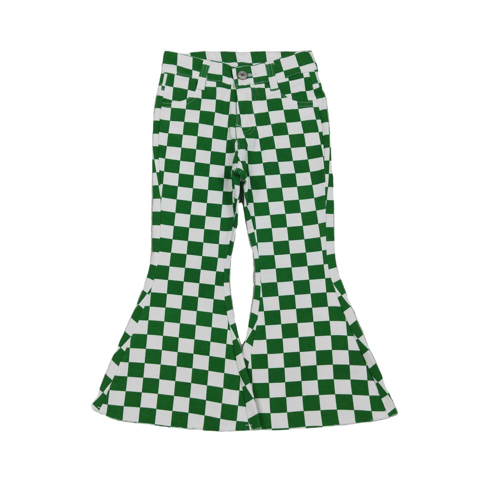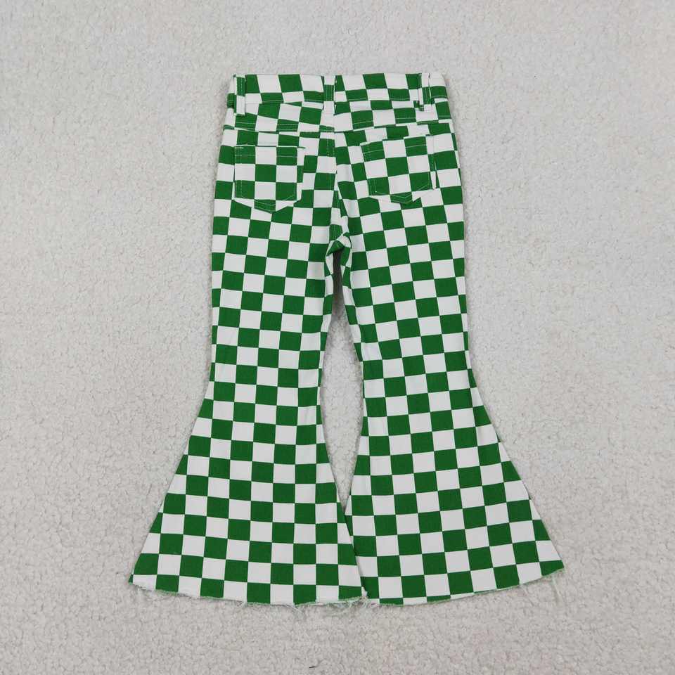 RTS Saint Patrick Green Plaid Print Lightweight Breathable Casual Flared Denim Jeans for Little Girls Kids Denim Pants Wholesale