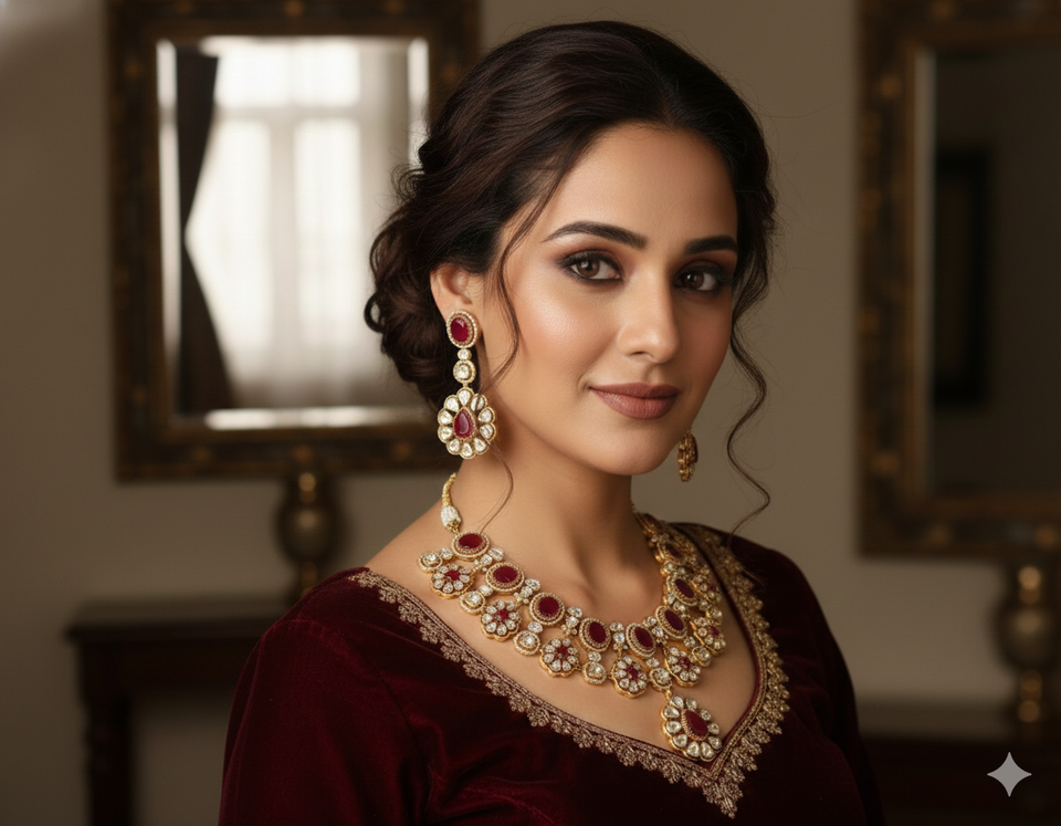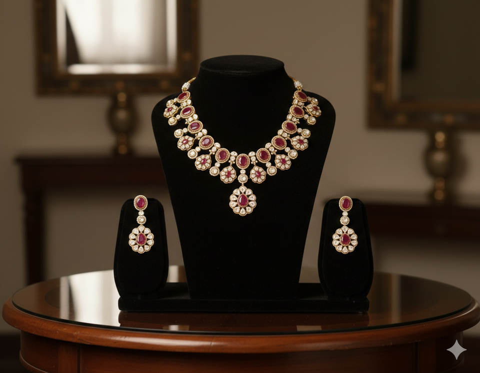 Raasika navratna royale heirloom necklace and earrings set hpandcrafted with premium deep ruby-red oval and teardrop stones