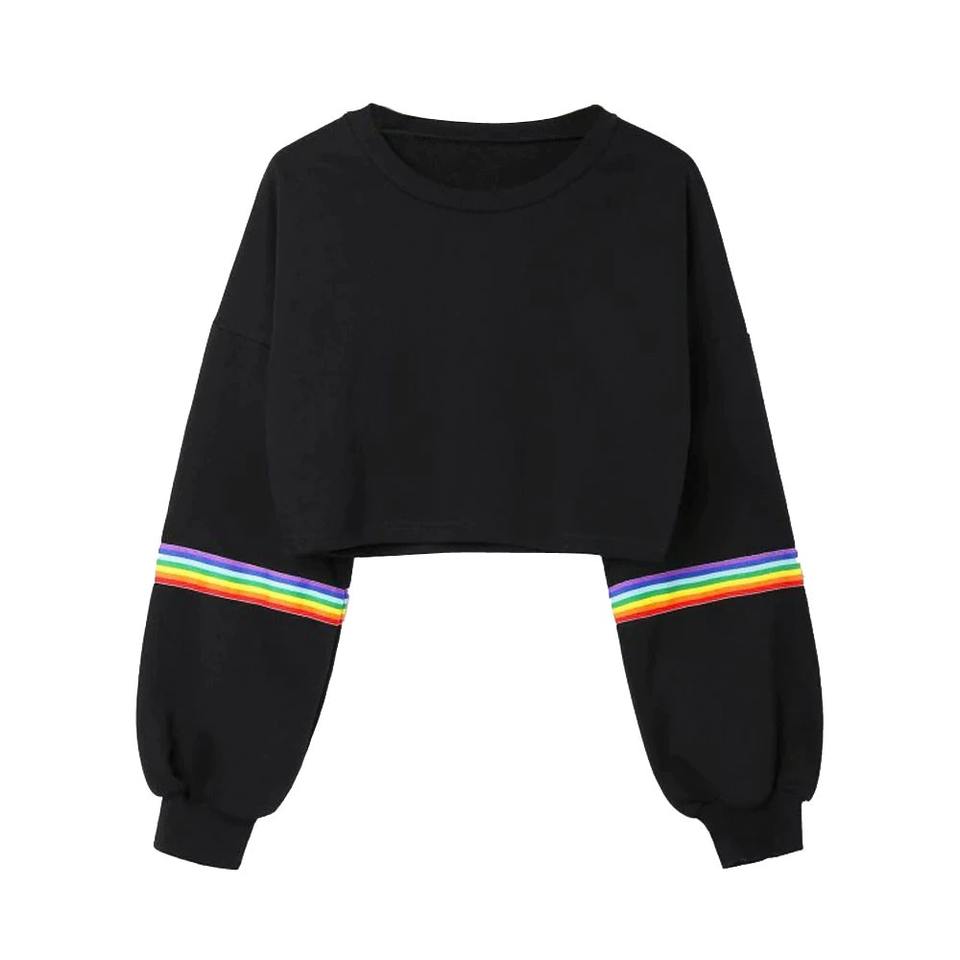 Rainbow Ladies Long Sleeve Striped Short Hooded Sweatshirt Pullover Black Pullover Casual Fashion Top Hoodie