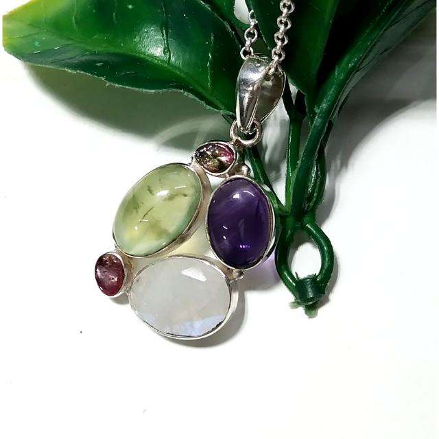 Rainbow Moonstone Amethyst Tourmaline Prehnite Multi-Gemstone Chain Pendant 925 Sterling Silver Charm Necklace Handmade Jewelry