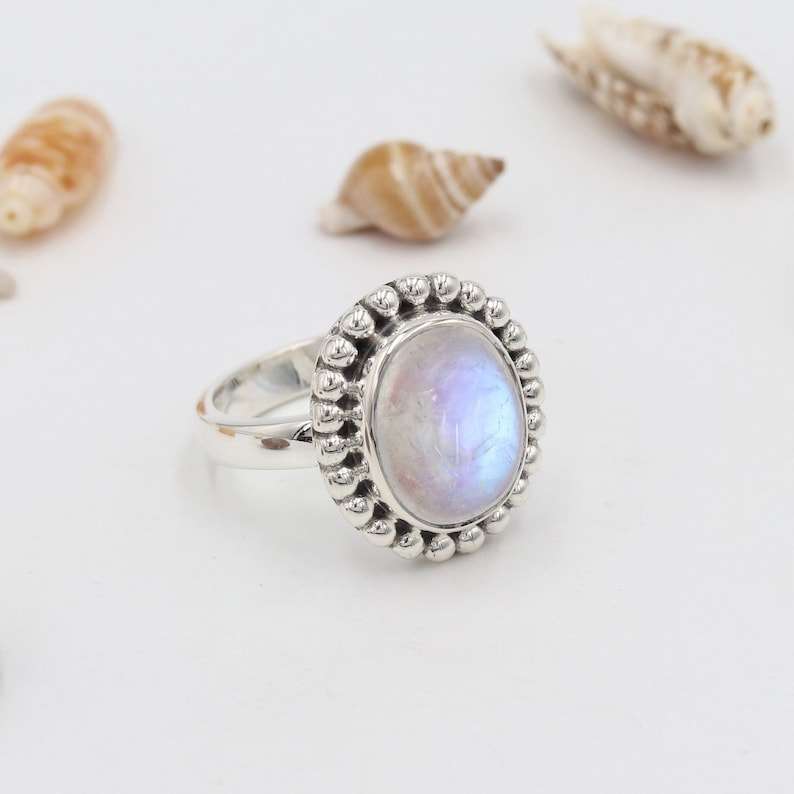 Rainbow Moonstone Ring Bezel Set Sterling Silver Statement Gemstone Ring Perfect June Birthstone Gift for Women Wedding Party