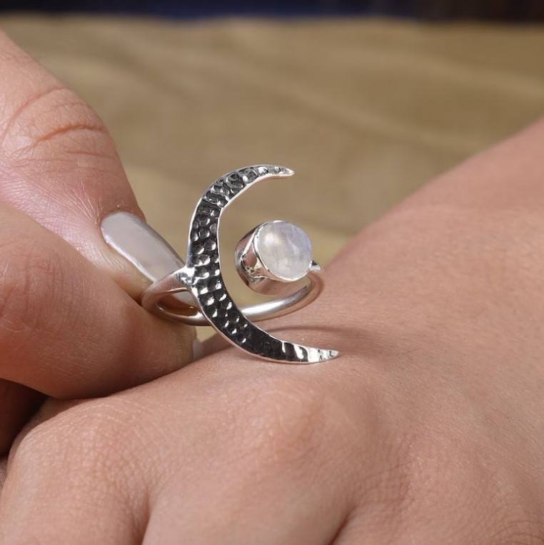 Rainbow Moonstone Solid 925 Sterling Silver Hammer Adjustable Ring Fine Wholesale Jewelry for Party Genuine Rainbow Moonstone