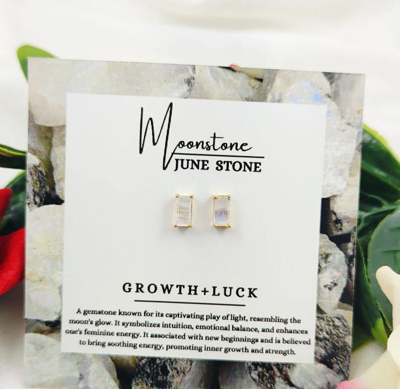 Rainbow Moonstone Stud Earring 8x4mm Baguette Cut 18K Gold Vermeil 925 Sterling Silver Prong Set Trendy Birthstone Stud Earring
