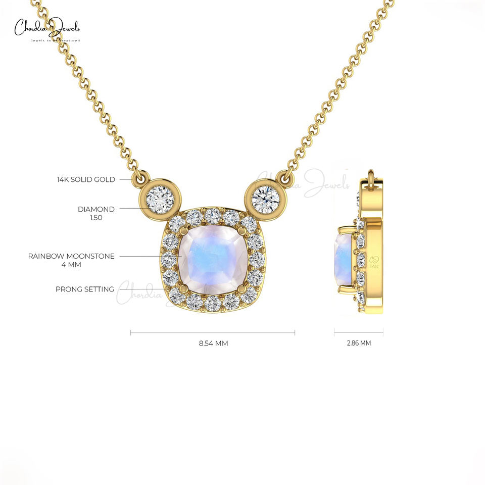 Rainbow Moonstone With Diamond Halo Necklace 4mm Cushion Cut Gemstone 14k Real Gold Hallmarked Jewelry Manufacturer & Supplier