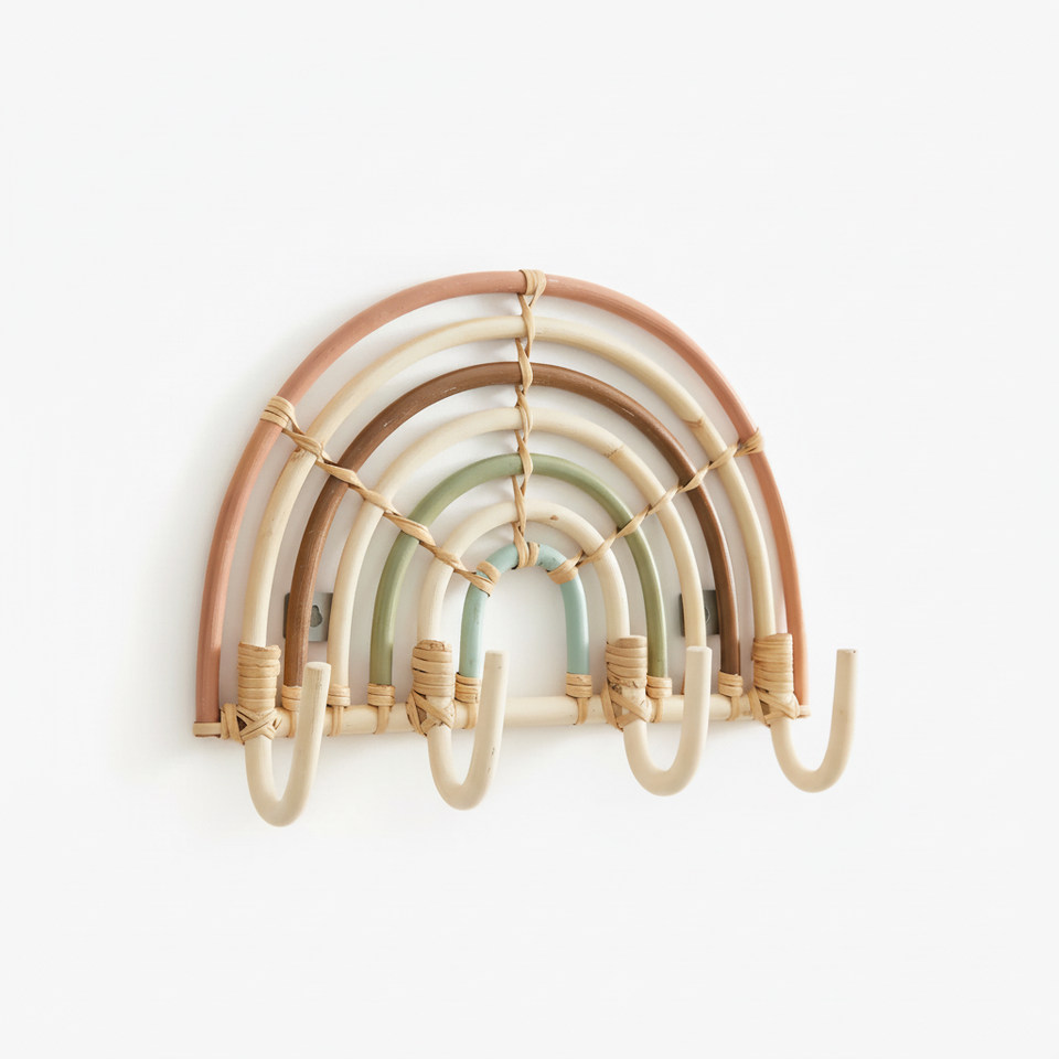 Rainbow-Shaped Rattan Hanging Rack with Four Hooks Handmade in Vietnam for Nursery Storage