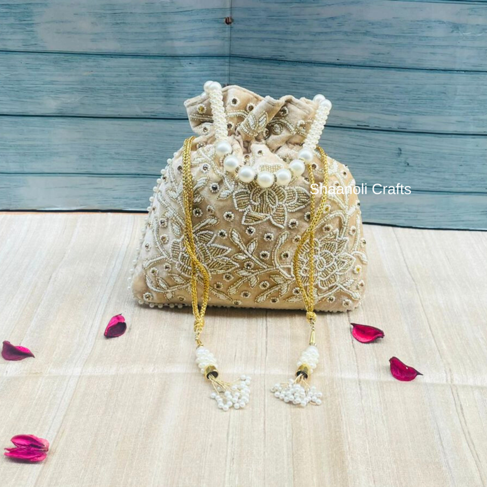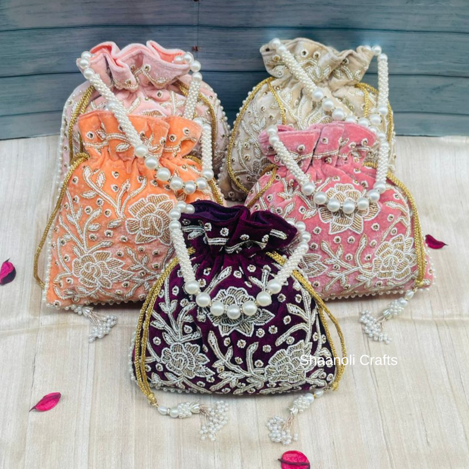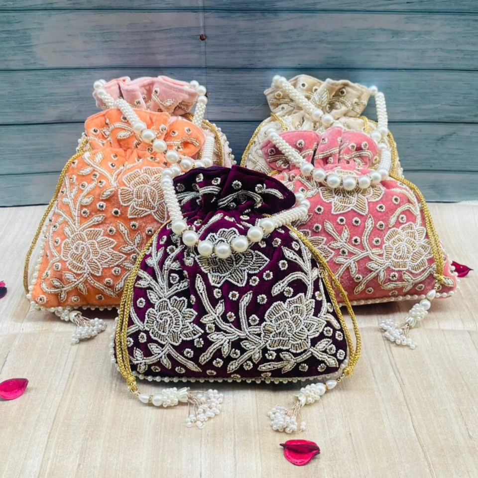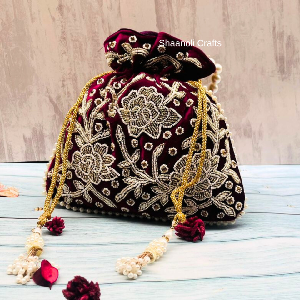 Rajasthani Potli Bags Handmade Flower and Leaf Pattern Zari Embroidered Potli Bags Beautiful Silk Latkan Potli Bags for Wedding