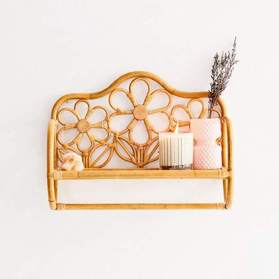 Rattan Wall Mounted Shelf Accent Wall Shelf Towel Bar/ Home Decoration Wicker Rattan Cane Floating Wall Shelf Flower Pattern